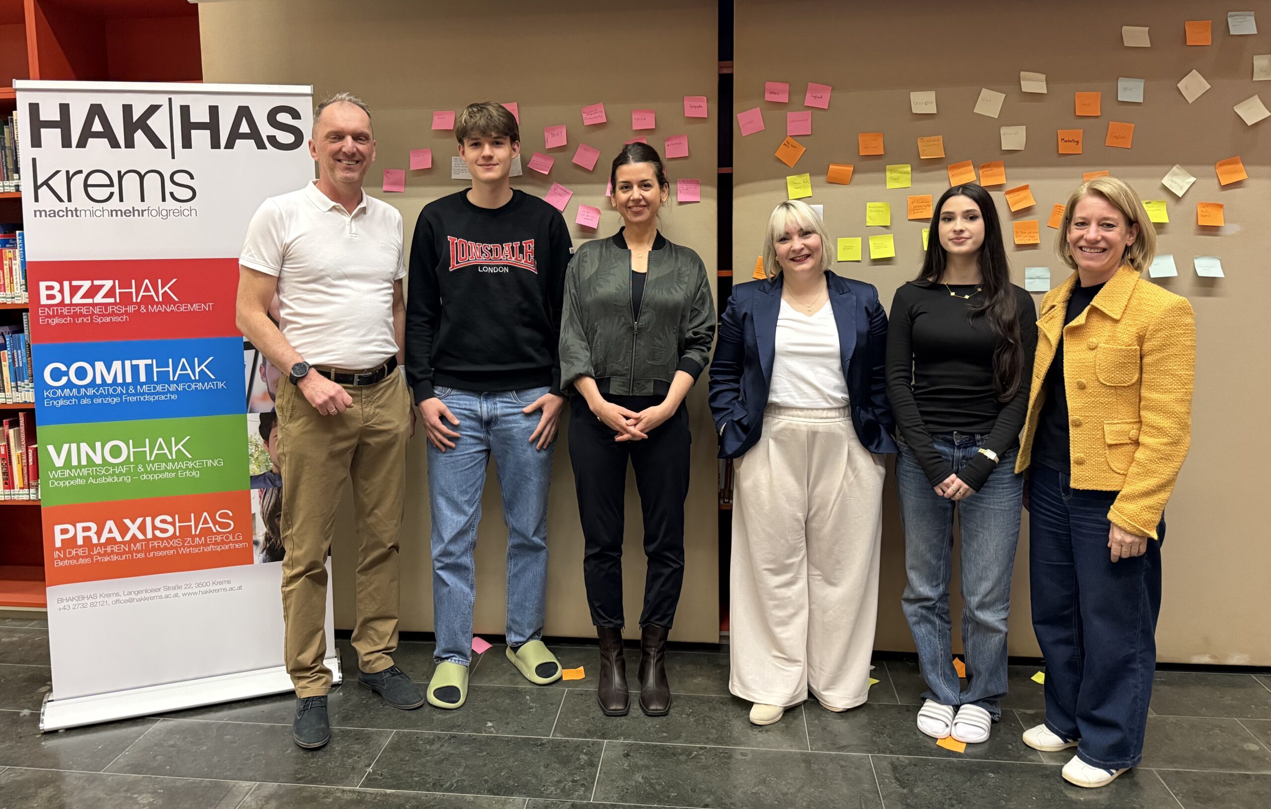 2 Lehrer:innen, 2 Schüler:innen und 2 Betreuerinnen des Entrepreneurship-Day stehen vor einer Wand mit Post-Its.