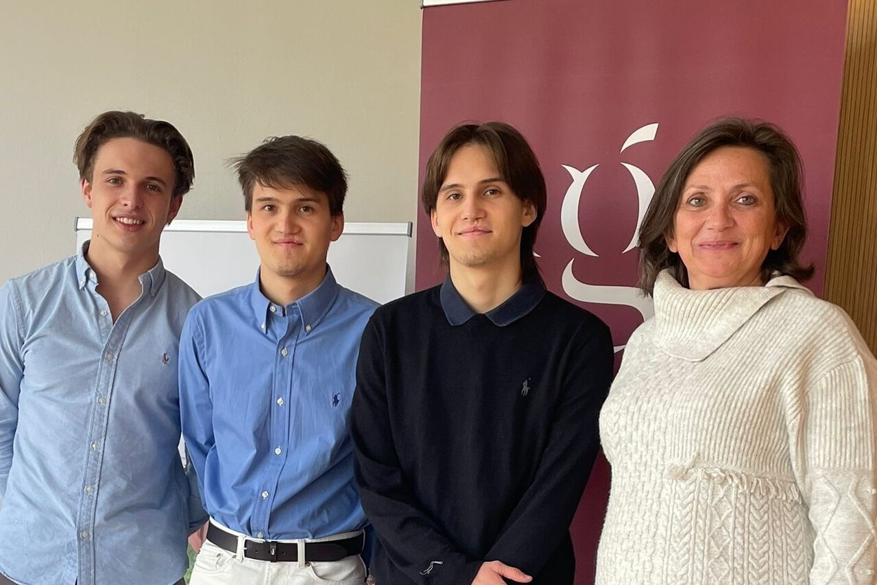 Vier Personen stehen nebeneinander, eine junge Frau steht mit offener Urkunde und weißer Rose in ihren Händen, die anderen 3 Personen stehen links und rechts von ihr und alle schauen in die Kamera und lächeln