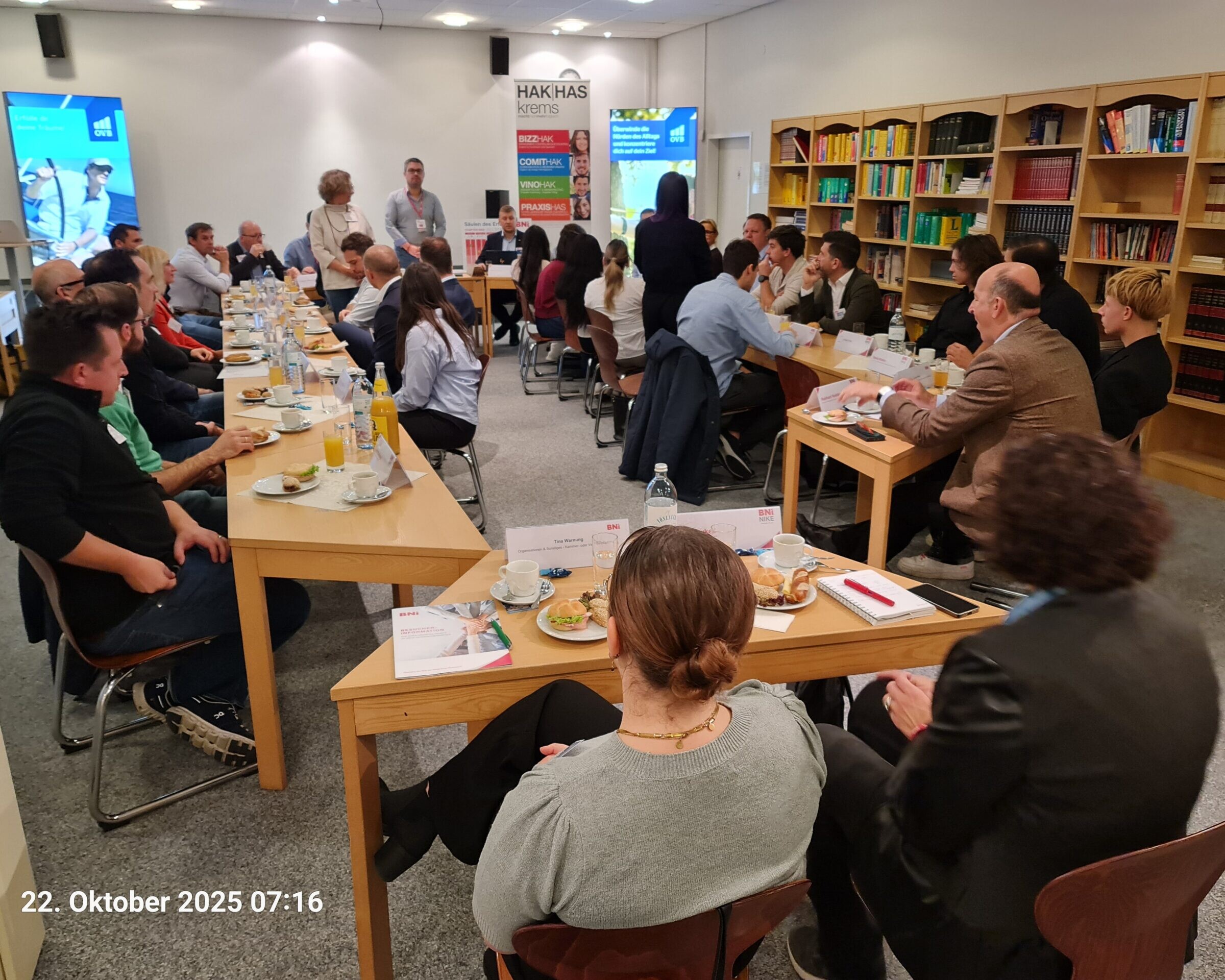 Bereits zum zweiten Mal nach 2024 fand an der HAK|HASkrems ein Unternehmerfrühstück des BNI-Unternehmernetzwerks Krems statt. Helena Csondor, Praise Efosa, Fatina Feta und Helin Türkmen aus der 4BK BIZZHAK präsentierten dazu ihre Junior Company „Gesundheitskompass“, die sie im Rahmen ihrer Teilnahme am Young Entrepreneurs Programme Austria das gesamte vergangene Schuljahr weiterentwickeln und mit ihr Erfolge bei Wettbewerben wie dem „Next Generation Businessplanwettbewerb“ erreichen konnten.